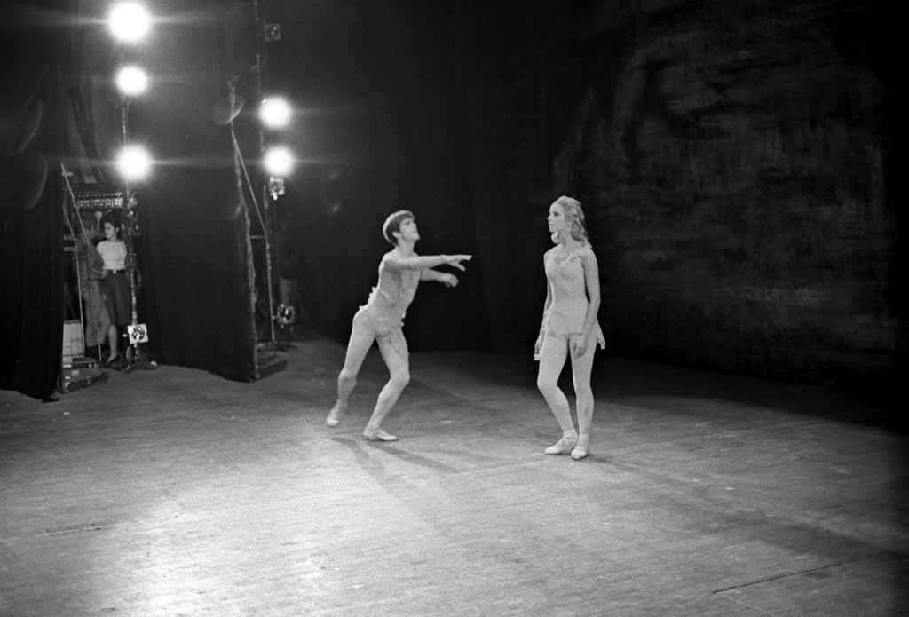 Daphnis welcomes a dazed Chloe upon her return from the pirates lair. Helgi Tomasson as Daphnis. Panchita de Peri as Chloe. Visible offstage is Principal Dancer Brunilda Ruiz talking with a pirate.