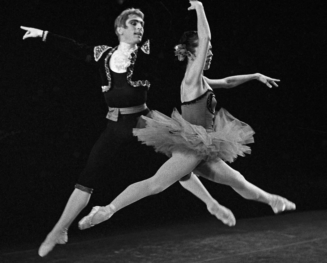 Erik Bruhn and Marjorie Tallchief perform grand jetes in the finale.