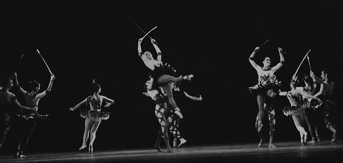 The corps and soloists in the finale. Left to right: Richard Wolf, Hester Fitzgerald, Marlene Rizzo, Suzanne Hammons and Barbara Livshin (in lifts), Karina Reiger, June Wilson and William Jacobs.
