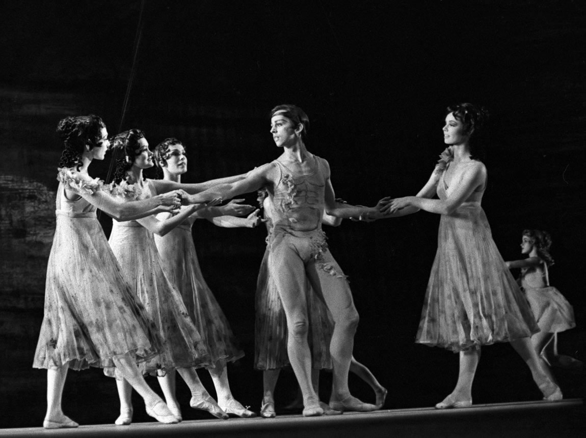 Chloe's companions comfort Daphnis. left to right: June Wilson, Sarah Thomas, Bonnie Mathis, Lawrence Rhodes as Daphnis, Lili Cockerille, Kathleen Bannon